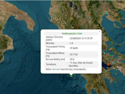 Σεισμός 3,4 βαθμών της κλίμακας Ρίχτερ σημειώθηκε στη Ζάκυνθο.