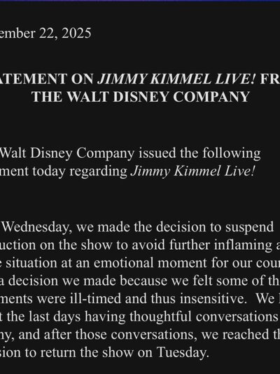 «Περάσαμε τις τελευταίες μέρες κάνοντας σοβαρές συζητήσεις με τον Τζίμι και, έπειτα από αυτές τις συνομιλίες, αποφασίσαμε να επιστρέψουμε με την εκπομπή την Τρίτη», ανέφερε χαρακτηριστικά η Disney σε επίσημη ανακοίνωσή της.