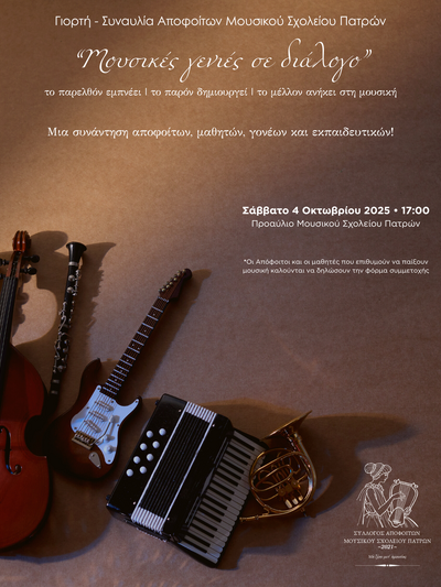 Το Μουσικό Σχολείο Πάτρας και ο Σύλλογος Αποφοίτων του προσκαλούν μικρούς και μεγάλους σε μια ξεχωριστή μουσική συνάντηση, το Σάββατο 4 Οκτωβρίου 2025, στις 17:00, στο προαύλιο του Σχολείου (Πάροδος ΕΒ 30, Εγλυκάδα).