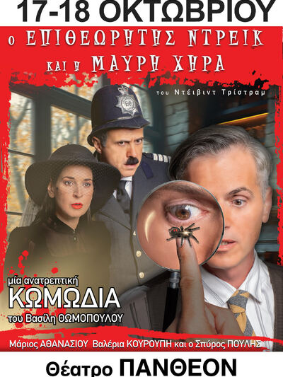 Η κωμική παράσταση “ο Επιθεωρητής Ντρέικ και η Μαύρη χήρα ” του βρετανού συγγραφέα David Tristram παρουσιάζεται για πρώτη φορά στο Ελληνικό κοινό, σε σκηνοθεσία του Βασίλη Θωμόπουλου. Ένας φόνος ,δεκαέξι ύποπτοι! Με χιούμορ και κωμικές ανατροπές, η παράσταση μας εισάγει σε έναν κόσμο μυστηρίου, όπου ο επιθεωρητής Ντρέικ και ο αρχιφύλακας Πλόντ προσπαθούν να διαλευκάνουν ένα περίπλοκο έγκλημα. Η σκηνοθεσία του Βασίλη Θωμόπουλου αναδεικνύει τον σατιρικό χαρακτήρα του Tristram, μεταφέροντας το κοινό σε μια θεότρελη ατμόσφαιρα μυστηρίου που προσφέρουν γέλιο και ψυχαγωγία.