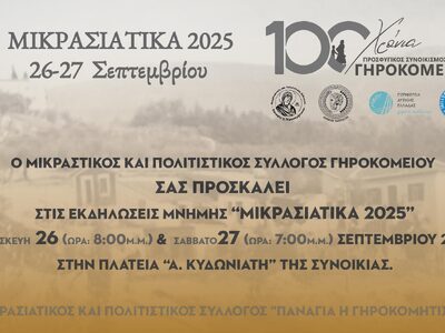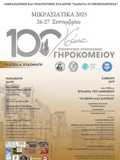 Με τη συμμετοχή δύο τμημάτων του καλλιτεχνικού ομίλου της «Πολυφωνικής Χορωδίας» Πάτρας, του Θεατρικού Εργαστηρίου (Διεύθυνση: Αθηνά Καλλιμάνη Γεωργιτσοπούλου) και της Ορχήστρας και Χορωδίας Παραδοσιακής Μουσικής «ΗΛΙΟΔΩΡΙΑ» (Διεύθυνση: Γιάννης Παναγιωτόπουλος), πραγματοποιούνται τα «Μικρασιάτικα 2025» την Παρασκευή 26 και το Σάββατο 26 Σεπτεμβρίου 2025.