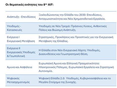Σε συντονισμό με τις προτεραιότητες της αγοράς και τις διεθνείς τάσεις, το 8ο AIF παρουσιάζει μια θεματολογία αιχμής, με σταθερούς πυλώνες τις ενότητες Ανάπτυξη – Επενδύσεις, Υποδομές – Κατασκευές, Ενέργεια και Ψηφιακός Μετασχηματισμός.