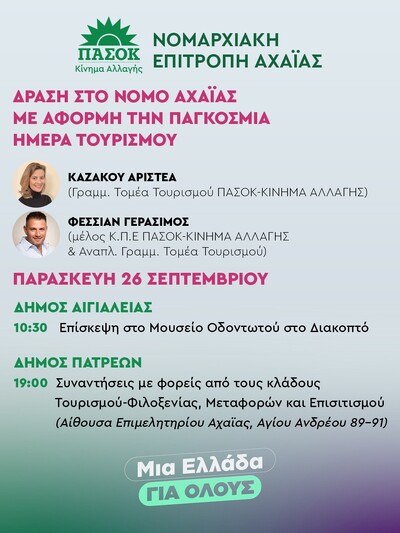 Η Νομαρχιακή Επιτροπή Αχαΐας του Πανελληνίου Σοσιαλιστικού Κινήματος με αφορμή την Παγκόσμια Ημέρα Τουρισμού την Παρασκευή 26 Σεπτέμβρη, συν διοργανώνει με τον Τομέα Τουρισμού με την παρουσία της Γραμματέας του Τομέα Αριστέας Καζάκου, συναντήσεις - ενημερώσεις στον Δήμο Αιγιαλείας και Πατρέων, με επαγγελματίες του Κλάδου Τουρισμού – Φιλοξενίας, Επισιτισμού και Μεταφορών, με στόχο την καταγραφή και συζήτηση θεμάτων που αφορούν τις ανάγκες των επιχειρήσεων και των εργαζομένων.