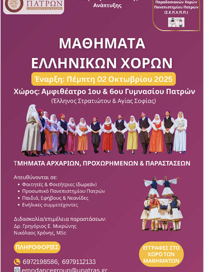 Αναλυτικές πληροφορίες στο σύνδεσμο: https://www.upatras.gr/enarxi-mathimaton-chorou-2025-2026-ston-syllogo-ellinikon-paradosiakon-choron-panepistimiou-patron-s-e-p-ch-p-p-02-10-2025/