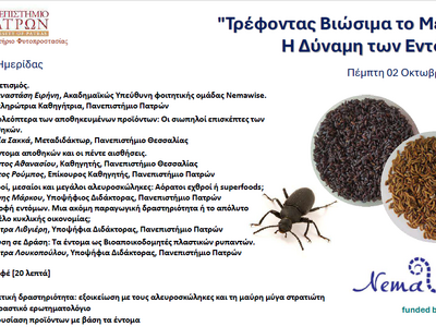 "Τρέφοντας Βιώσιμα το Μέλλον: Η Δύναμη των Εντόμων", την Πέμπτη 02/10/2025, στο Αμφιθέατρο του Τμήματος Γεωπονίας (Κτήριο Κ24), στην Πανεπιστημιούπολη του Μεσολογγίου.