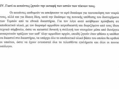 Στην αναφορά τους υπογραμμίζουν ότι η διαδικασία εκταφής και λήψης δειγμάτων παρουσία αρμόδιου ιατροδικαστή είναι σύντομη και δεν θα καθυστερήσει τη δίκη. Παράλληλα, τονίζουν ότι η εκταφή είναι αναγκαία για τη διασφάλιση πλήρους διερεύνησης των αιτίων του θανάτου των παιδιών τους.