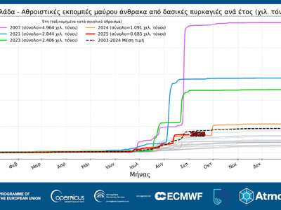 Αναφορικά με την Ελλάδα για το 2025, όπως σημειώνει η ομάδα του AtmoHub, από την αρχή του έτους μέχρι τα τέλη Αυγούστου, οι εκπομπές μαύρου άνθρακα στη χώρα μας έφτασαν τους 685 τόνους, ακολουθώντας τον μέσο όρο των ετών 2003-2024.