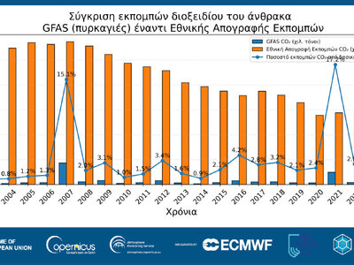 Ειδικότερα, όσον αφορά τις εκπομπές δασικών πυρκαγιών στην Ελλάδα, σε γράφημα (Γράφημα 1*) παρουσιάζονται οι συνολικές ετήσιες εκπομπές διοξειδίου του άνθρακα (CO2) από πυρκαγιές για την Ελλάδα, με χρήση των δεδομένων του Παγκόσμιου Συστήματος Αφομοίωσης Πυρκαγιών (GFAS) του CAMS (μπλε ράβδοι), καθώς και οι ετήσιες ανθρωπογενείς εκπομπές διοξειδίου του άνθρακα στην χώρα, στα πλαίσια της εθνικής απογραφής εκπομπών διοξειδίου του άνθρακα* (πορτοκαλί ράβδοι, εξαιρούνται οι εκπομπές από Χρήση Γης, Αλλαγών Χρήσεων Γης και Δασοπονίας – LULUCF).