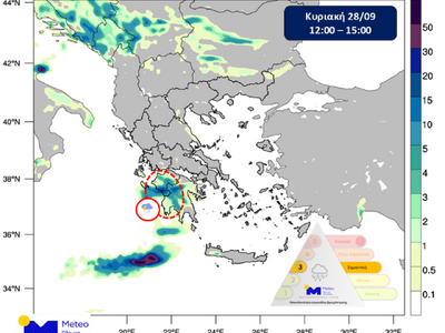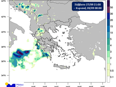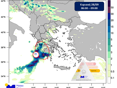 Ισχυρές βροχές και καταιγίδες προβλέπονται μέχρι και το βράδυ της Κυριακής (28-9-2025), στο Ιόνιο (περιοχή Ζακύνθου, Κεφαλονιάς, Ιθάκης, Λευκάδας), την Αιτωλοακαρνανία, τη δυτική Πελοπόννησο (Αχαΐα, Ηλεία, Μεσσηνία) και τις νότιες περιοχές της Ηπείρου (νομοί Άρτας και Πρέβεζας).