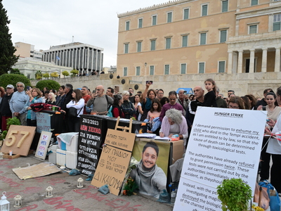Στη συγκέντρωση βρέθηκαν για να συμπαρασταθούν στον αγώνα του απεργού πείνας και άλλοι συγγενείς θυμάτων της τραγωδίας των Τεμπών, όπως άλλωστε κάνουν καθημερινά, μεταξύ των οποίων και η Μαρία Καρυστιανού.