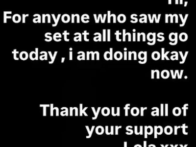 Λίγες ώρες αργότερα, η ίδια θέλησε να καθησυχάσει τους θαυμαστές της με ανάρτηση στο Instagram, όπου έγραψε: «Γεια, για όποιον είδε το πρόγραμμά μου στο All Things Go σήμερα, είμαι καλά τώρα. Ευχαριστώ για όλη τη στήριξή σας xxx». Το περιστατικό συνέβη μόλις μια μέρα μετά την ακύρωση συναυλίας την Παρασκευή «λόγω ενός ευαίσθητου ζητήματος».