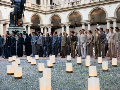 Tα μοντέλα- παλιότερα και νεότερα- παρέλασαν στο εσωτερικό αίθριο της πινακοθήκης, η οποία στις σάλες της φιλοξενεί την έκθεση «Giorgio Armani: Milano, per amore» αποδεικνύοντας την γενικότερη επίδραση του couturier στην πόλη.