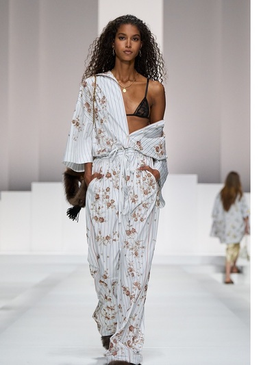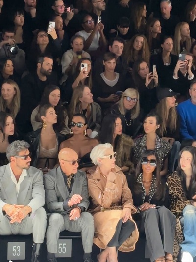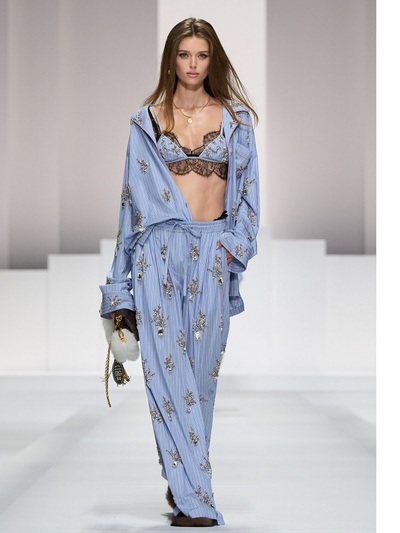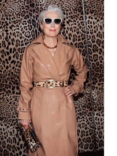 Η κορυφαία ηθοποιός ήταν ντυμένη με βινίλ μπεζ πανωφόρι και λεοπάρ ζώνη των Dolce e Gabbana αντιπροσωπεύοντας γενικότερα το style της ηρωίδας της. Μπήκε στο χώρο μαζί με τους συμπρωταγωνιστές της Στάνλει Τούτσι και Σιμόν Ασλει και κάθησε front row δίπλα στους Ναόμι Κάμπελ και Μικέλε Μορόνε. Aφομοιώθηκε άμεσα στο κοινό του event χειροκροτώντας κεντημένα pyjama looks.