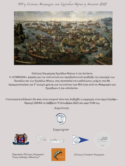 Ο πολιτιστικός φορέας «ΣΥΜΜΑΧΙΑ» που συμβάλλει με το έργο του στην πολιτιστική και περιβαλλοντική ανάδειξη της περιοχής των Οινιαδών και των νήσων Εχινάδων, διοργανώνει για 5η συνεχή φορά τις εκδηλώσεις μνήμης για την 454η επέτειο από την ιστορική ναυμαχία των Εχινάδων ή «Λεπάντο».
