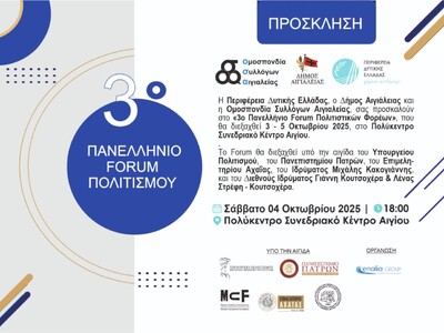 Η Περιφέρεια Δυτικής Ελλάδας, ο Δήμος Αιγιαλείας και η Ομοσπονδία Συλλόγων Αιγιαλείας, διοργανώνουν την κεντρική εκδήλωση του «3ου Πανελλήνιου Forum Πολιτιστικών Φορέων», που θα πραγματοποιηθεί αυτό το Σάββατο 4 Οκτωβρίου 2025 και ώρα 18:30, στο Πολύκεντρο Συνεδριακό Κέντρο Αιγίου.