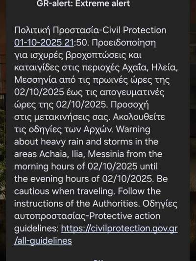 Το μήνυμα κάνει λόγο για ισχυρές βροχές και καταιγίδες από τις πρωινές ώρες της 01/10/20255 έως τις απογευματικές ώρες της ίδιας ημέρας σε Αχαΐα , Ηλεία και Μεσσηνία.