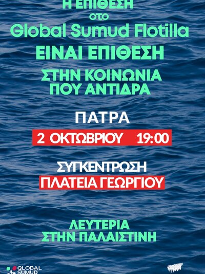 Το ΣΕΡΕΤΕ Αχαΐας καταγγέλλει την τρομοκρατική και παράνομη επίθεση του Ισραηλινού στρατού στο διεθνή στόλο αλληλεγγύης Global Sumud Flotilla, που επιχειρεί να σπάσει τον αποκλεισμό της Γάζας και να παραδώσει ανθρωπιστική βοήθεια στον ηρωικό λαό της Παλαιστίνης.