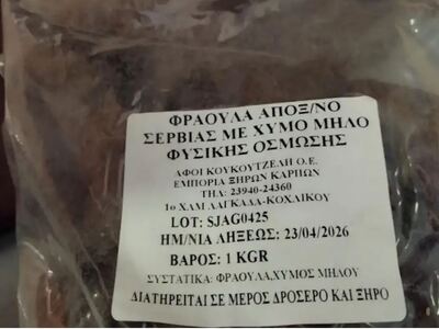 Πρόκειται για προϊόν προέλευσης Σερβίας σε πλαστική κλειστή συσκευασία 1Kg, με αριθμό παρτίδας SJAG0425 και ανάλωση κατά προτίμηση πριν από: 23/04/2026 που διατίθεται από την επιχείρηση «ΑΦΟΙ ΚΟΥΚΟΥΤΖΕΛΗ ΟΕ» με έδρα στον 1ο χλμ Λαγκαδά – Κολχικού.