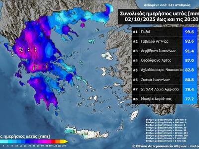 Στους Παξούς καταγράφηκε το μεγαλύτερο αθροιστικό ύψος βροχής έως τις 20:20 της Πέμπτης 02/10 και ήταν ίσο με 99.6 χιλιοστά. Στη Δυτική Ελλάδα το περισσότερο νερό έπεσε στη Γαβαλού Αιτωλοακαρνανίας και στο Αχλαδόκαστρο Ναυπακτίας.