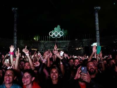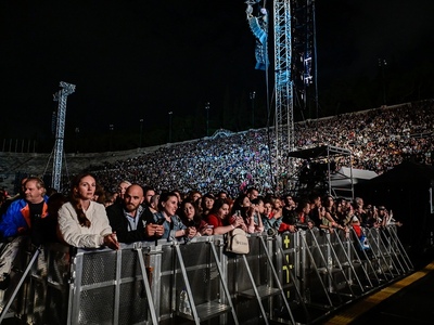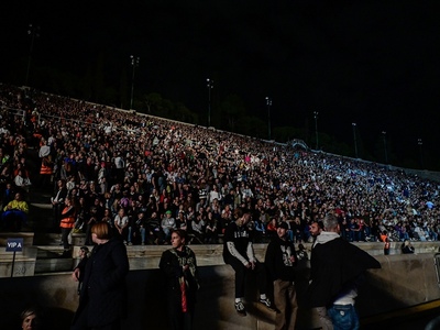 Η βροχή δεν πτοεί τους θαυμαστές του Βρετανού σούπερ σταρ, που έχουν γεμίσει το Παναθηναϊκό Στάδιο για να απολαύσουν τις μεγάλες επιτυχίες του.