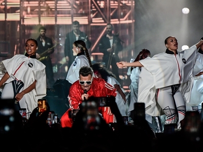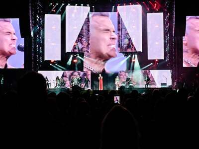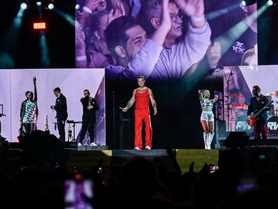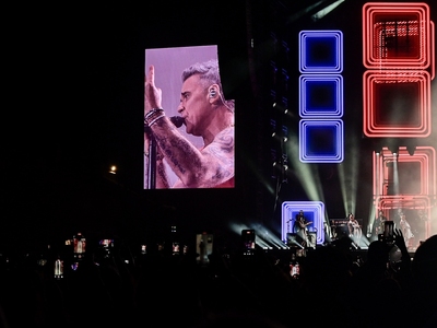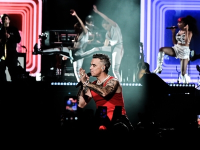 Το κοινό ξέσπασε σε χειροκροτήματα και ενθουσιασμό μόλις ο Ρόμπι Γουίλιαμς έκανε την είσοδό του στη σκηνή, φορώντας κόκκινο αμάνικο και παντελόνι ίδιου χρώματος.