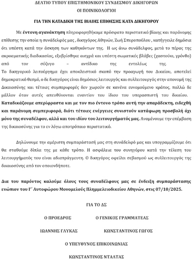 «Η άσκηση σωματικής βίας και απειλής κατά γυναίκας δικηγόρου την ώρα που ασκεί το ιερό καθήκον του δικηγορικού λειτουργήματος αποτελεί τη χειρότερη μορφή παραβίασης θεμελιωδών συνταγματικών δικαιωμάτων και ελευθεριών», αναφέρεται στην κοινή ανακοίνωση που ανάρτησε ο ποινικολόγος Θέμης Σοφός. Παράλληλα εκφράζεται απογοήτευση για την περιορισμένη αντίδραση του προέδρου του Δ.Σ.Α., καθώς - όπως τονίζεται - «τέτοιου είδους τυπικά σημειώματα δίνουν θάρρος σε κάθε βίαιο χαρακτήρα να επαναλάβει τέτοιες πράξεις».