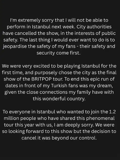 Προσθέτει ότι η Κωνσταντινούπολη θα ήταν ο τελευταίος σταθμός της περιοδείας και μάλιστα ότι θα εμφανιζόταν για πρώτη φορά εκεί. «Λυπάμαι βαθιά. Περιμέναμε αυτή τη συναυλία αλλά η απόφαση να ακυρωθεί ήταν πέρα από τον έλεγχό μας».