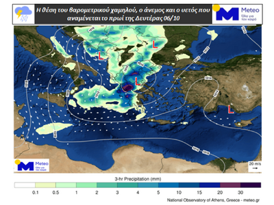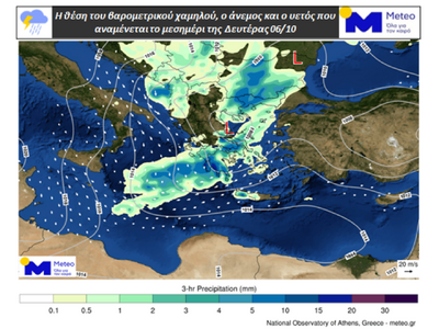 Χάρτης 1. Η θέση του βαρομετρικού χαμηλού, ο άνεμος κοντά στο έδαφος και ο υετός που αναμένεται το πρωί της Δευτέρας 06/10