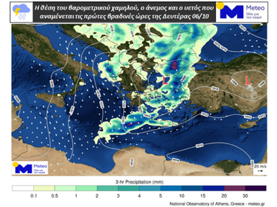- Στους σχετικούς χάρτες παρουσιάζεται η θέση του βαρομετρικού χαμηλού, ο άνεμος κοντά στο έδαφος και ο υετός που αναμένεται (1) το πρωί, (2) το μεσημέρι και (3) τις πρώτες βραδινές ώρες της Δευτέρας 06/10