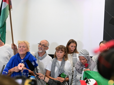 Δεκάδες κόσμου βρέθηκαν στο αεροδρόμιο από το μεσημέρι της Δευτέρας για να υποδεχθούν τους ακτιβιστές, που επέστρεψαν από το Ισραήλ -ανάμεσά τους και οι 27 Έλληνες- κρατώντας πανό με συνθήματα υποστήριξης, λουλούδια καθώς και παλαιστινιακές σημαίες.