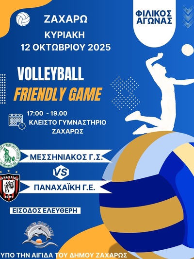 Ένας σπουδαίος φιλικός αγώνας βόλεϊ γυναικών θα διεξαχθεί στο ουδέτερο γήπεδο της Ζαχάρως, ανάμεσα σε δύο ιστορικές ομάδες του ελληνικού Βόλεϊ, του ΜΕΣΣΗΝΙΑΚΟΥ Γ.Σ. και της Παναχαϊκής Γ.Ε., στο πλαίσιο της προετοιμασίας τους για τη νέα αγωνιστική περίοδο.
