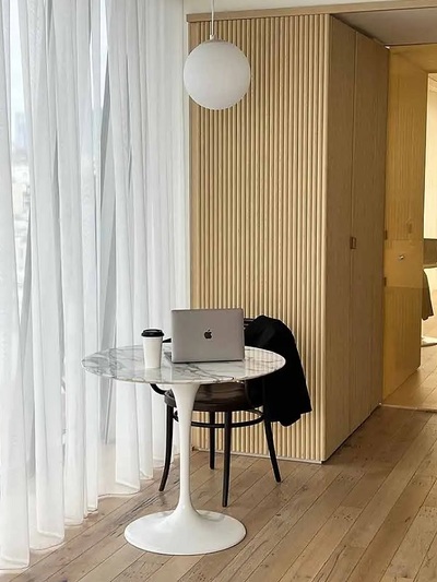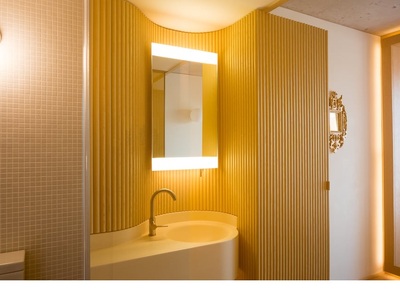 Το ύφος παραπέμπει σε ιαπωνικό… farmhouse, καθώς το ξύλο διαμορφώνει γεωμετρικά την κρεβατοκάμαρα, το χολ εργασίας, τη λειτουργικότητα του μπάνιου. «Τέτοιες επιφάνειες είναι πιο αναπάντεχες από έναν flat τοίχο και ένδειξη αρχιτεκτονικής ποιότητας» υποστηρίζουν οι σχεδιαστές.
