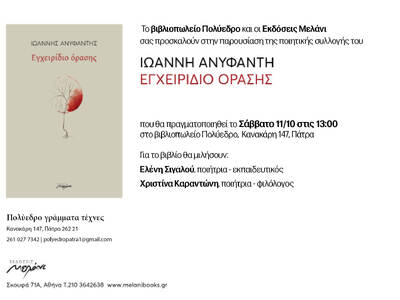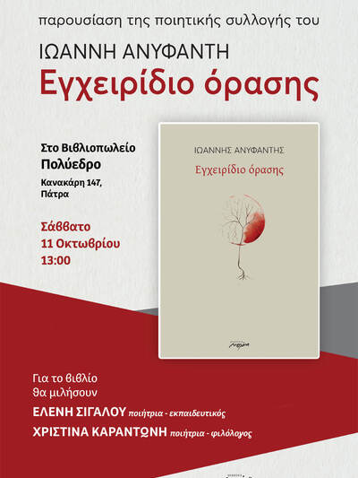 Παρουσιάζεται στο Πολύεδρο, στην οδό Κανακάρη 147, στην Πάτρα αυτό το Σάββατο 11 Οκτωβρίου 2025, στη 1 το μεσημέρι, η ποιητική συλλογή «Εγχειρίδιο όρασης» του Ιωάννη Ανυφαντή, που κυκλοφορεί από τις εκδόσεις Μελάνι.