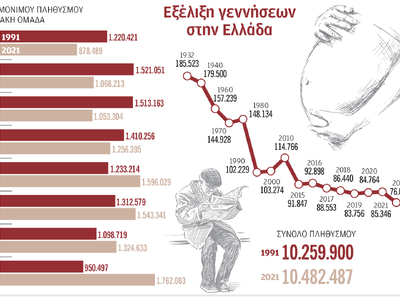 Για να αντιληφθεί κάποιος καλύτερα την αλλαγή που έχει συντελεσθεί στην ελληνική κοινωνία τα τελευταία 30 χρόνια, αρκεί να δει τη σύνθεση του πληθυσμού με βάση την ηλικία. Ετσι, ενώ σύμφωνα με τα στοιχεία της απογραφής του 1991 τα παιδιά έως 9 ετών αποτελούσαν περίπου το 12% του μόνιμου πληθυσμού στην Ελλάδα, το 2021 αποτελούσαν το 8,38%. Σε απόλυτους αριθμούς, το 1991 είχαν καταγραφεί περίπου 1,22 εκατ. παιδιά έως 9 ετών, ενώ το 2021 ο αριθμός τους ήταν κάτω από 880.000. Συνολικά ο πληθυσμός έως 19 ετών ήταν 2,74 εκατ. το 1991, έναντι 1,94 εκατ. το 2021, ποσοστά 26,7% και 18,5% αντιστοίχως του συνολικού μόνιμου πληθυσμού. Από την άλλη, ο πληθυσμός ηλικίας 60 ετών και άνω ξεπερνούσε τα 3 εκατ. το 2021, έναντι 2,04 εκατ. το 1991.