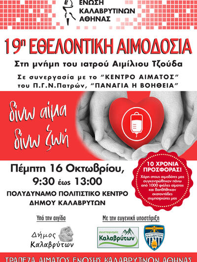 Αυτή την Πέμπτη 16 Οκτωβρίου 2025, θα πραγματοποιηθεί η 19η Εθελοντική Αιμοδοσία σε συνεργασία με το Κέντρο Αίματος του Πανεπιστημιακού Γενικού Νοσοκομείου Πατρών "Παναγία η Βοήθεια" στο Πολυδύναμο Πολιτιστικό Κέντρο Καλαβρύτων, αναφέρει ανακοίνωση της Ένωσης Καλαβρυτινών Αθήνας όπου πρόεδρος είναι η Ελένη Γ. Χάμψα και γραμματέας η Αντιόπη Καμπά - Χονδρονικόλα.