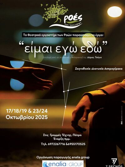 Το έργο «Είμαι εγώ εδώ» (επιλογή από τα 20 αστικά μονόπρακτα) της Δώρας Τσόγια θα παρουσαιστεί στις 17, 18, 19 και 23, 24 Οκτωβρίου 2025 στις 21.00 στο θέατρο Γραμμές Τέχνης στην Μαιζώνος 271 μετά την Παπαφλέσσα στην Πάτρα, από τη θεατρική ομάδα Ροές, Δράσεις Πολιτισμού.