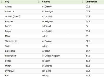 Νέα στοιχεία που αφορούν τον ευρωπαϊκό Δείκτη Εγκληματικότητας δημοσιεύθηκαν από τη Numbeo, με δύο ελληνικές πόλεις να βρίσκονται ανάμεσα στις 20 πιο επικίνδυνες σε όλη την Ευρώπη.