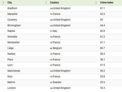 Η πλειοψηφία της πρώτης 5αδας έχει βρετανικό αέρα, με τις 4 από αυτές -Μπράντφορντ, Κόβεντρι, Μπέρμιγχαμ και Λονδίνο- να βρίσκονται στο Ηνωμένο Βασίλειο. Το Μπράντφορντ μάλιστα έχει δείκτη εγκληματικότητας 67,1, τον υψηλότερο δηλαδή στην Ευρώπη.
