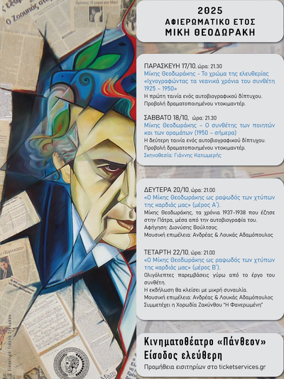 Για τις προβολές των ντοκιμαντέρ για τον Μίκη Θεοδωράκη απαιτηθεί η προμήθεια δελτίου εισόδου τα οποία είναι διαθέσιμα στο link: https://www.ticketservices.gr/event/2025-afieromatiko-etos-mikis-theodorakis/?lang=el