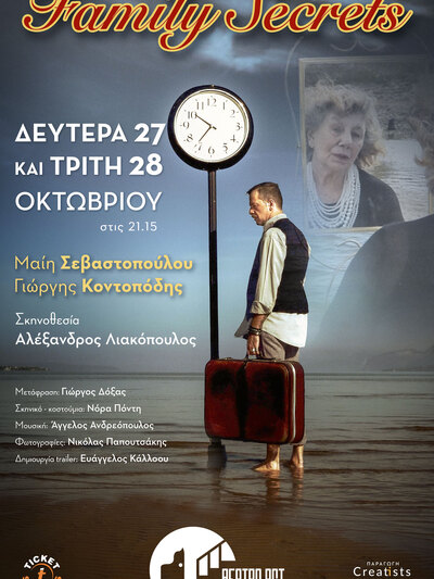 Το έργο "Family Secrets", μία Ιταλική μαύρη κωμωδία του Enrico Luttman σε σκηνοθεσία του Αλέξανδρου Λιακόπουλου, με τη Μαίη Σεβαστοπούλου και τον Γιώργη Κοντοπόδη, πρόκειται να παρουσιαστεί στο Θέατρο act στο πάνω μέρος στις σκάλες Γεροκωστοπούλου, στην Πάτρα, τη Δευτέρα 27 και Τρίτη 28 Οκτωβρίου 2025.