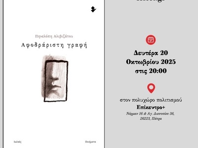 Αυτή τη Δευτέρα 20 Οκτώβρη 2025, στις 8 το βράδυ, θα παρουσιαστεί σε εκδήλωση στον Πολυχώρο Πολιτισμού Επίκεντρο+ στην οδό Νόρμαν και Αγ. Διονυσίου στην Πάτρα, η ποιητική συλλογή με τίτλο «Αφοδράριστη γραφή» της Πατρινής συγγραφέως Πηνελόπης (Πόπης) Αλιβιζάτου. Το βιβλίο κυκλοφόρησε τον Μάη 2025 από τις εκδόσεις Ιωλκός και έχει αποκομίσιε θετικά σχόλια.