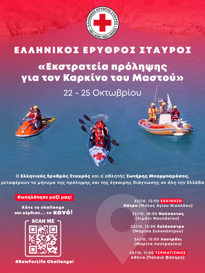 Ο Ελληνικός Ερυθρός Σταυρός ενώνει τις δυνάμεις του με τον αθλητή μεγάλων αποστάσεων Σωτήρη Μπαρμπαρόσο και κωπηλατεί από την Πάτρα έως την Αθήνα, μεταφέροντας ένα μήνυμα ελπίδας, δύναμης και πρόληψης για τον καρκίνο του μαστού.