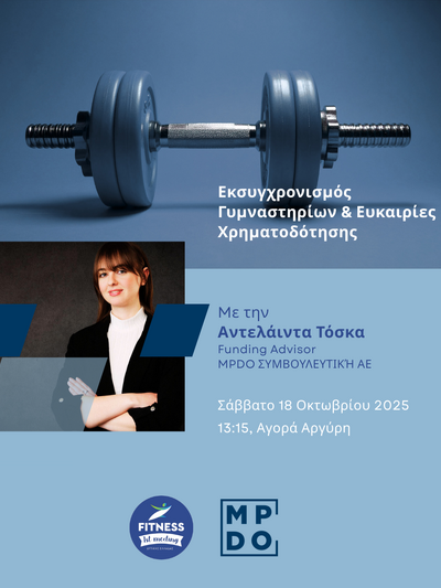 Πέραν της στήριξης στην πρωτοβουλία, η MPDO θα συμμετάσχει στο Fitness Meeting με την παρουσίαση «Εκσυγχρονισμός Γυμναστηρίων & Ευκαιρίες Χρηματοδότησης», με ομιλήτρια την Αντελάιντα Τόσκα, Funding Advisor της εταιρείας, το Σάββατο 18 Οκτωβρίου 2025, στις 13:15, στην Αγορά Αργύρη (Πάτρα). Στο πλαίσιο της εισήγησης θα παρουσιαστούν ενεργές ευκαιρίες χρηματοδότησης για γυμναστήρια και επιχειρήσεις άθλησης και ευεξίας καθώς και η Δράση «Εκσυγχρονισμός Μικρής Επιχειρηματικότητας Δυτικής Ελλάδας 2025», στο πλαίσιο του προγράμματος «Δυτική Ελλάδα 2021–2027». Η Δράση, για την οποία αναμένεται η πρόσκληση, προσφέρει ισχυρή χρηματοδοτική στήριξη στις μικρές επιχειρήσεις της Περιφέρειας για τεχνολογικό εκσυγχρονισμό, ψηφιακή μετάβαση και βιώσιμη ανάπτυξη, με προϋπολογισμό 23 εκατ. ευρώ και επιχορηγήσεις έως 50% στοχεύοντας στην ενίσχυση της ανταγωνιστικότητας, την προώθηση πράσινων και ψηφιακών επενδύσεων και τη δημιουργία νέων αναπτυξιακών προοπτικών στην τοπική αγορά.