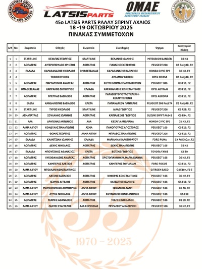 Η λίστα συμμετοχών ξεχειλίζει από τη ποιότητα τους καθώς ανάμεσα στους συνδυασμούς που δίνουν το παρών στη διοργάνωση του Α.Ο.Π – Αυτοκινητιστικός Όμιλος Πατρών βρίσκονται πρωταθλητές του πανελληνίου πρωταθλήματος ράλλυ, συνδυασμοί από το εξωτερικό καθώς και ταχύτατα αγωνιστικά δίδυμα που θα ξεσηκώσουν με τα περάσματα τους, τους φίλους του μηχανοκίνητου αθλητισμού που θα παρευρεθούν στον αγώνα.