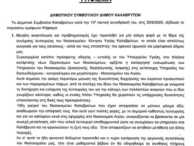 Το Δημοτικό Συμβούλιο Καλαβρύτων, κατόπιν διαλόγου, αποφάσισε ομόφωνα την έκδοση Ψηφίσματος με ημερομηνία 30-9-2025, με το οποίο αντιτίθεται στην κατάργηση του Νοσοκομείου Καλαβρύτων (Κέντρο Υγείας, στην ουσία, όπως τώρα τυπικά αναφέρεται). Συγκεκριμένα στο ψήφισμα τονίζεται ότι μεγάλη αναστάτωση και προβληματισμός έχει προκληθεί για ακόμη μία φορά με το θέμα της συνεχισης της λειτουργίας του Νοσοκομείου-Κέντρου Υγείας Καλαβρύτων που είνι απολύτως αναγκαίο για τους κατοίκους και τους επισκέπτες του ορεινού, ηρωικού και μαρτυρικού Δήμου των Καλαβρύτων.