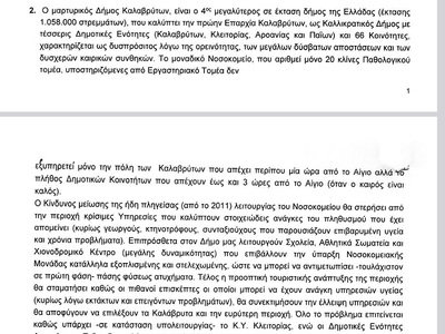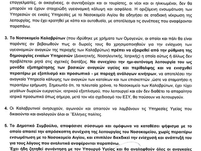 Ο κίνδυνος μείωσης της ήδη πληγείσας λειτουργίας από το 2011, του νοσοκομείου θα στερήσει από την περιοχή των Καλαβρύτων κρίσιμες υπηρεσίες που καλύπτουν στοιχειώδεις ανάγκες του πληθυσμού, αναφέρει το Ψήφισμα.