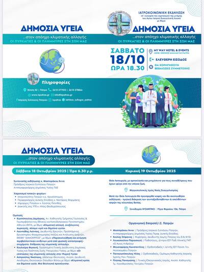 Με θέμα «Δημόσια Υγεία στον στόχο κλιματικής αλλαγής- Οι πυρκαγιές & οι πλημμύρες στη ζωή μας», η εκδήλωση φιλοδοξεί να ανοίξει έναν ουσιαστικό διάλογο για το πώς οι φυσικές καταστροφές, που εντείνονται λόγω της κλιματικής κρίσης, επηρεάζουν την υγεία και την καθημερινότητα των πολιτών.