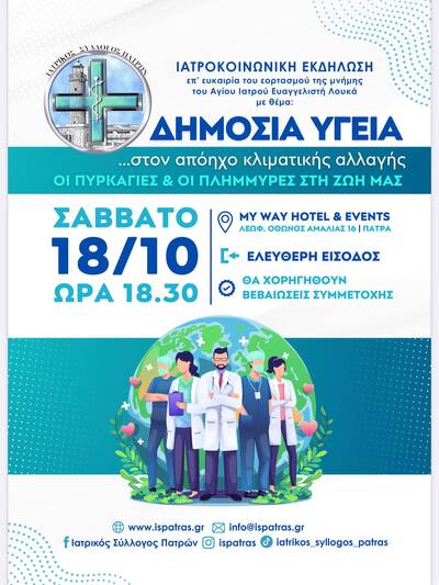 Η δημόσια υγεία και η κλιματική αλλαγή θα βρεθούν στο επίκεντρο μίας σημαντικής ιατροκοινωνικής εκδήλωσης που διοργανώνει ο Ιατρικός Σύλλογος Πατρών αύριο Σάββατο στις 6:30 μ.μ., στο My Way Hotel & Events (Αγ. Ανδρέου 213).