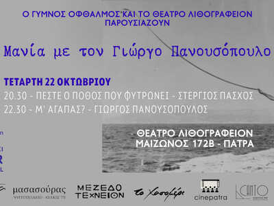 Αναφορικά με το δεύτερο μέρος του αφιερώματος του "Γυμνού Οφθαλμού" του Νίκου Καββαδία στον σημαντικό Έλληνα σκηνοθέτη Γιώργο Πανουσόπουλο με τον γενικό τίτλο "Μανία με τον Γιώργο Πανουσόπουλο", την Τετάρτη 22-10-2025 στο θέατρο Λιθογραφείον στην Πάτρα, υπάρχει σε σχέση με τον αρχικό προγραμματισμό, μια αλλαγή στη σειρά με την οποία θα προβληθούν οι ταινίες.