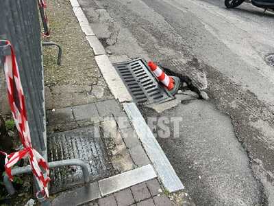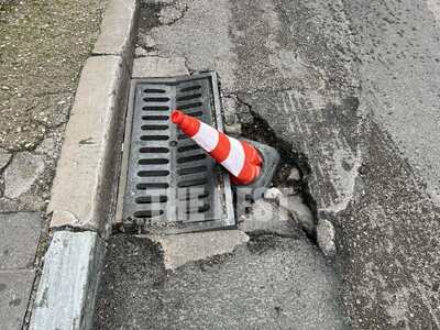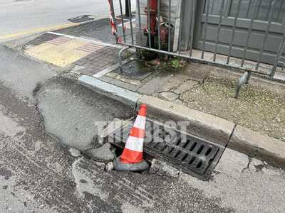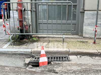 Όπως μπορείτε να δείτε στις φωτογραφίες, στο σημείο όπου βρίσκεται φρεάτιο, έχει σημειωθεί υποχώρηση και η περιοχή έχει σημανθεί.